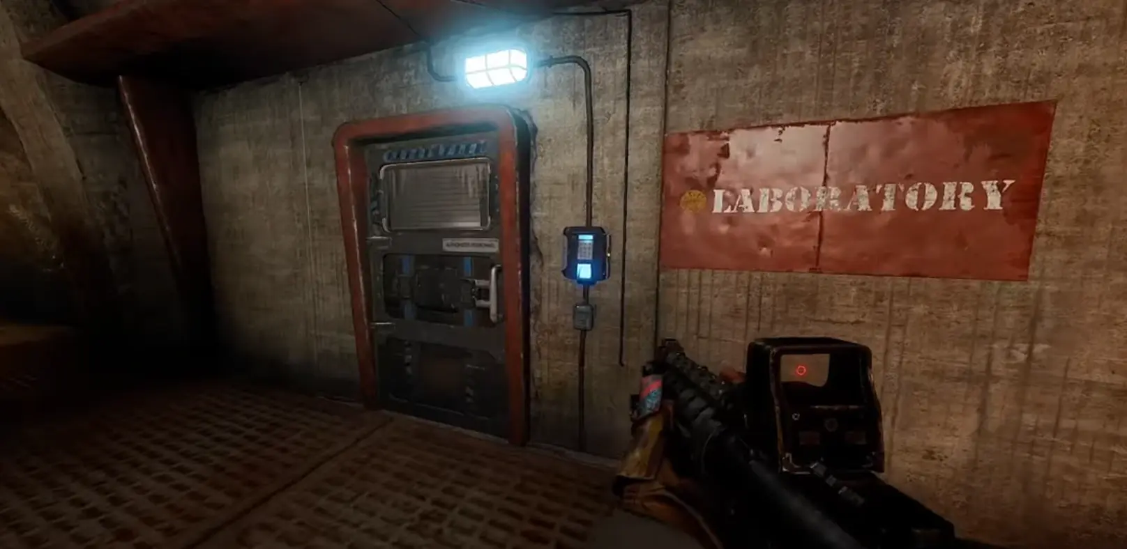 Further down the corridor you'll see another door inside with a blue card reader and a sign reading Laboratory.