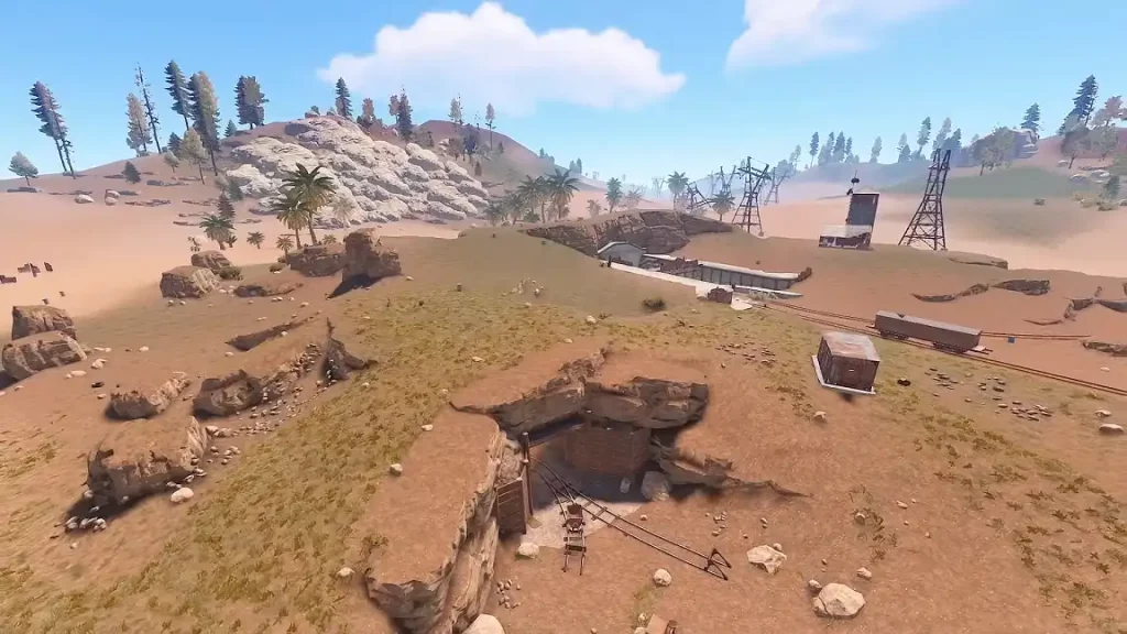 This tunnel contains railway tracks, mining equipment, and several resource nodes. Players can often find stone, metal, or sulfur deposits along the path.