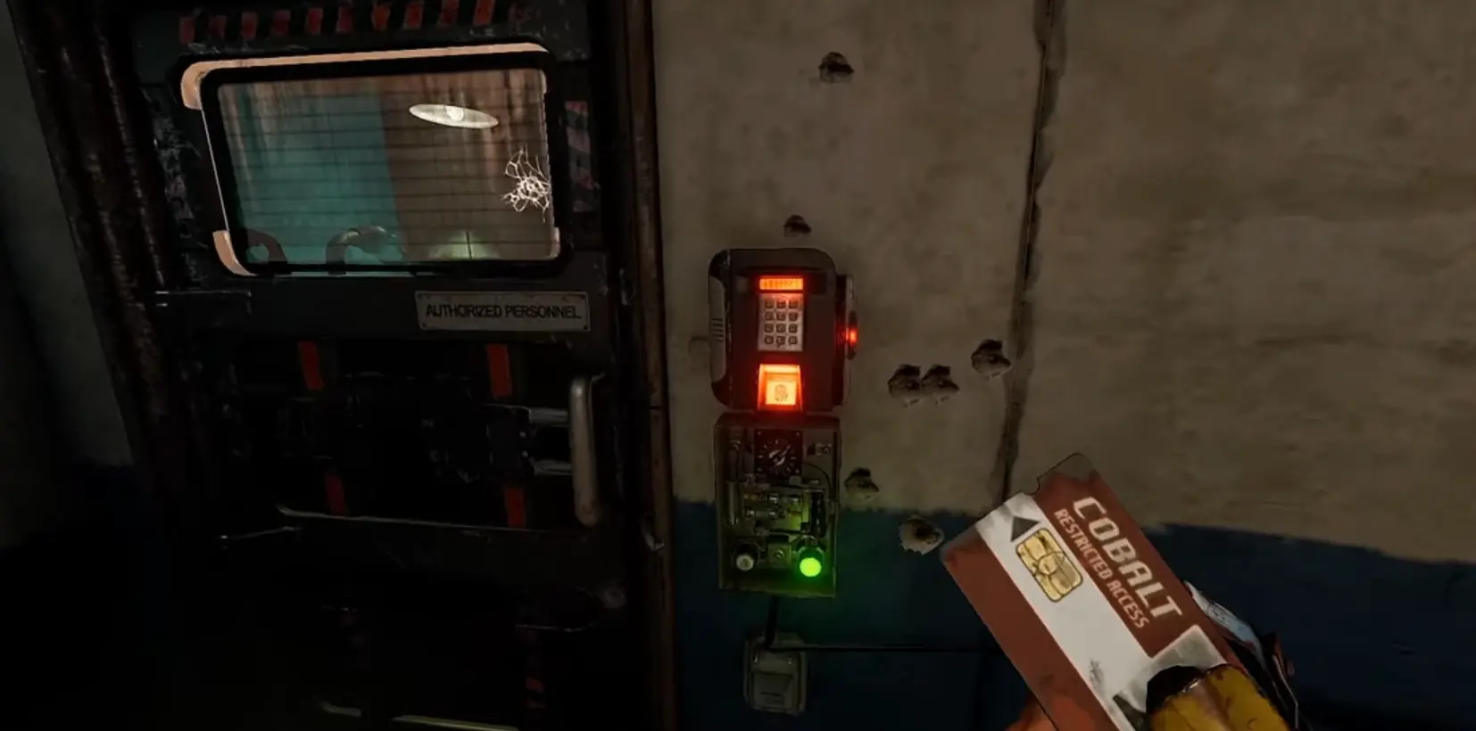Behind a crate on the platform is the green card reader. If the light is visible, pull out your keycard and swipe it to open the door.