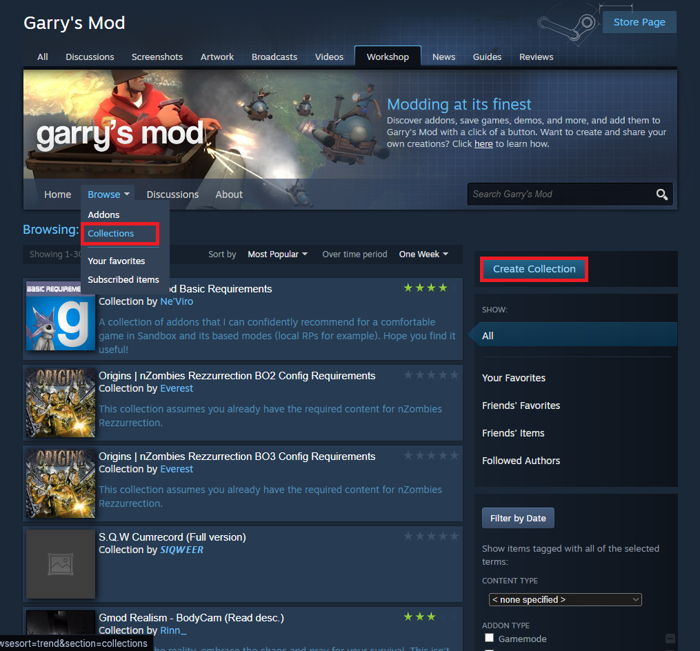 Once you’re in the GMod Workshop, hover over the Browse tab and select Collections. Click the Create Collection button on the far right.