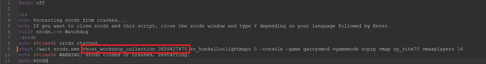 If you’re not a Physgun client and are using a dedicated server, you can open up your batch file and find +host_workshop_collection. Paste the ID directly in front of this option.