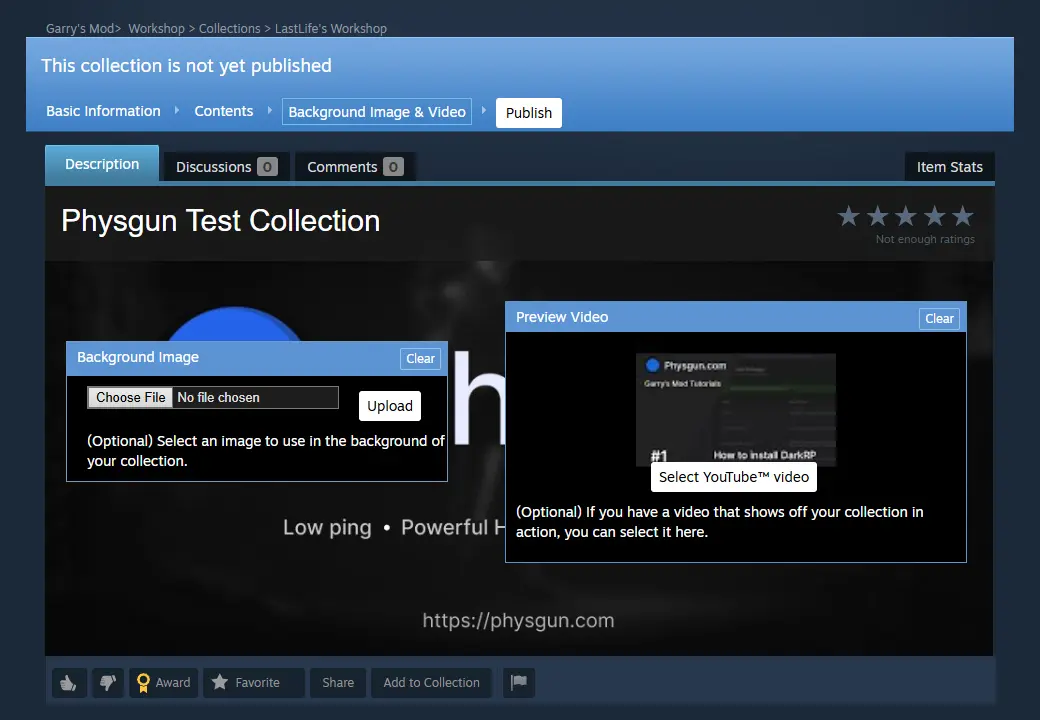 Lastly, you’ll be prompted to provide a background image and preview video. This is an entirely optional step, but it will make your collection more presentable to people who view it. Once you’re done, click Publish. You may have to wait a moment for your collection to be finalized because Steam has to check for any malicious code, links, or content that breaks the workshop terms of service.
