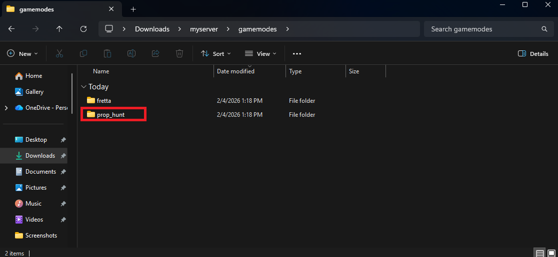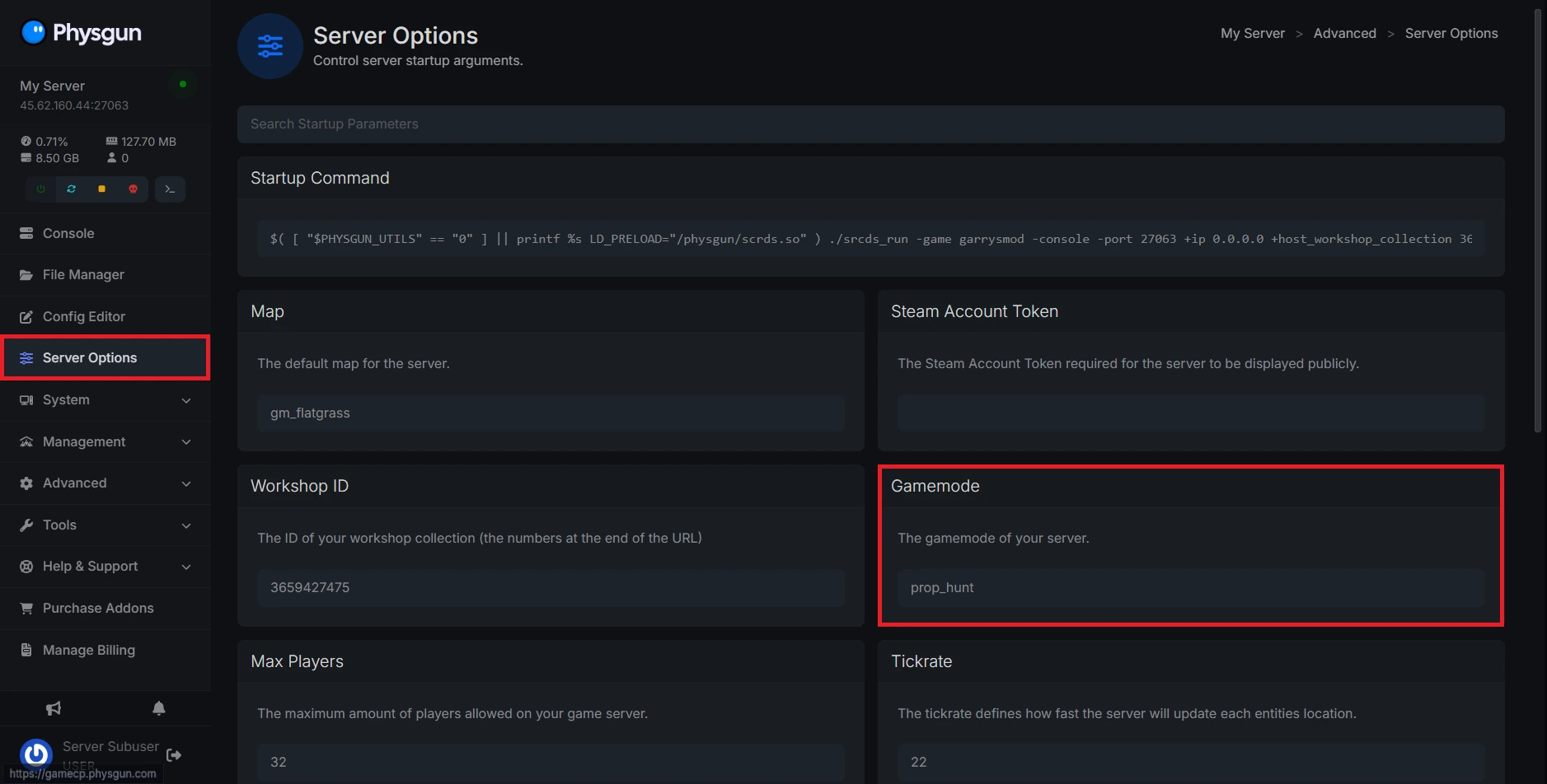 Now that you have your gamemode downloaded onto your server, you need to switch your server’s gamemode to the one you added. Whether you’re a Physgun client or hosting a server elsewhere, you’ll need to obtain the gamemode’s ID in order to do this. This corresponds to the name of the gamemode’s main folder and is the value needed for your server to know what files to access. For example, if you’re using Prop Hunt, you can find the ID in the server_folder/garrysmod/gamemodes/prop_hunt directory, with prop_hunt being the ID.
