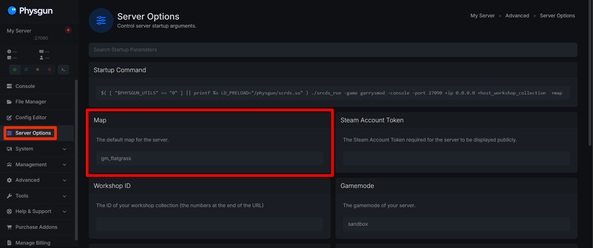 Note: If you cannot find the name of your map, start your server once after adding it to the workshop collection. Then, navigate to garrysmod/maps and you should find the filename of your map there (e.g. if your map file is named gm_construct.bsp, your map field in the startup command should just be gm_construct).