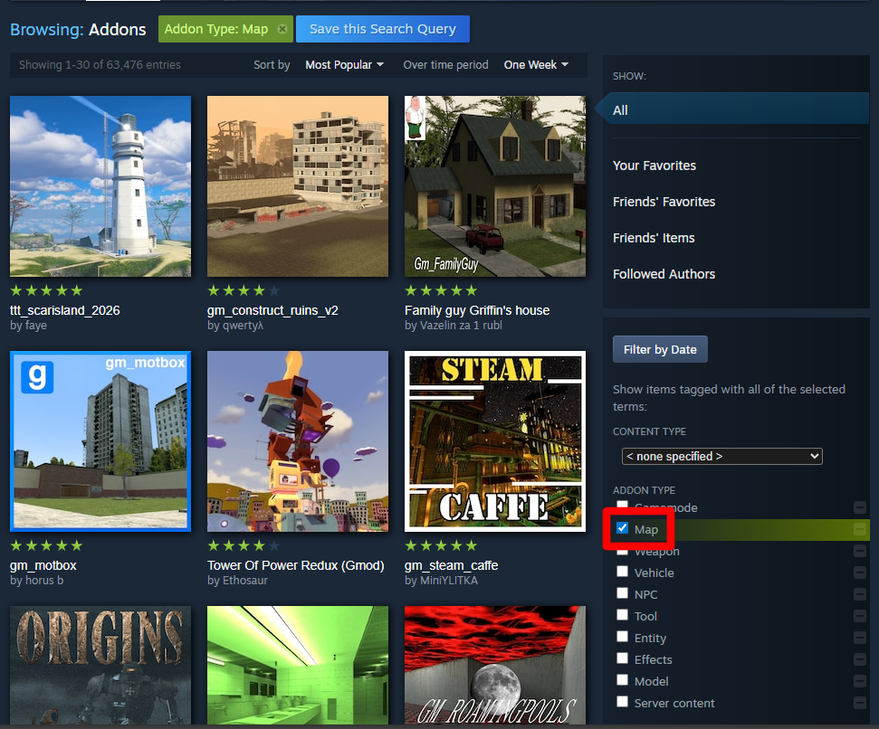 You can filter in the Steam Workshop for Garry’s Mod by Map to make it easier to find new maps.