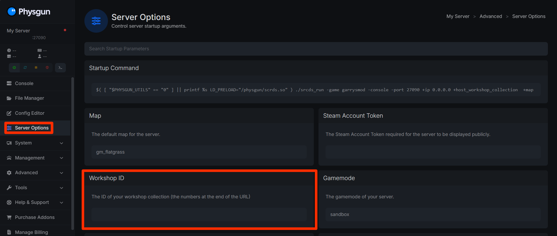 Adding Addons From The Workshop: Head to the Server Options tab on the left side nav bar and select it. Then, find the Workshop ID section. Here, you can add the ID for a workshop collection you have created on Steam!