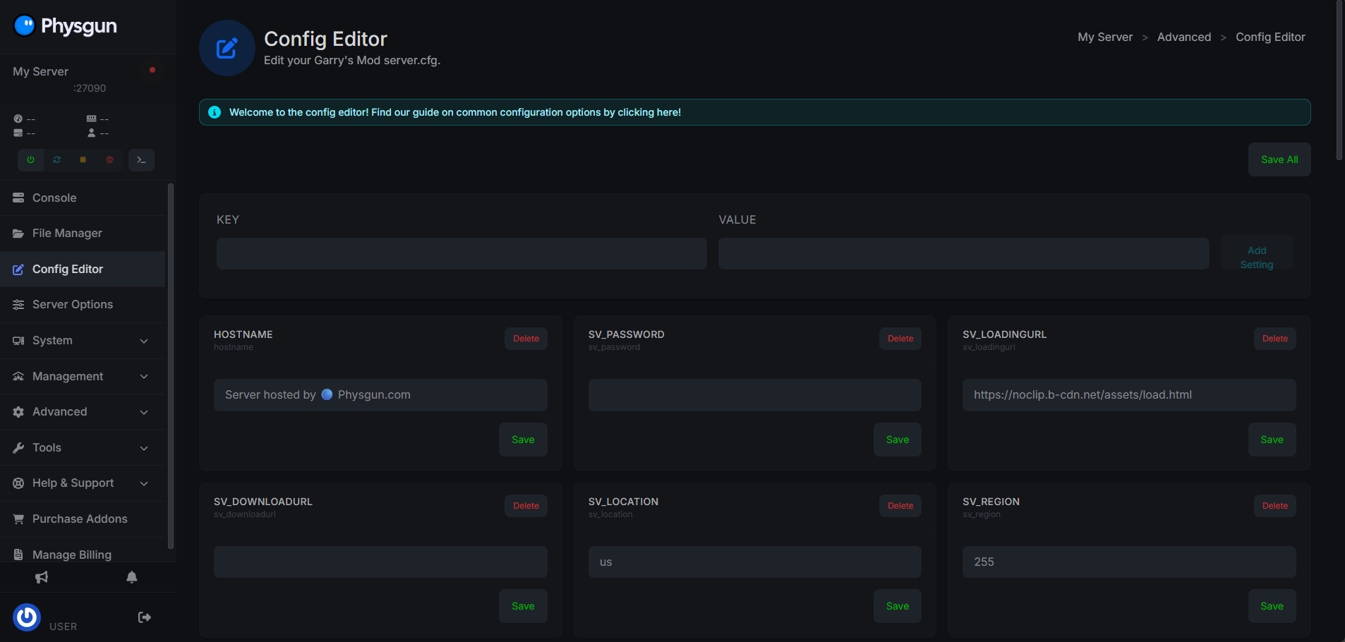 Login to the Gamepanel: After deployment is finished, head over to the Physgun Gamepanel. There, you’ll see your GMod server ready to manage. Physgun’s modern gamepanel allows you to click to change settings like the hostname or max players, without ever touching config files!