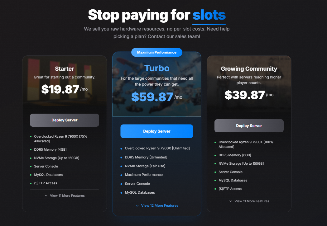 Physgun offers GMod server hosting plans that let you launch a server in minutes through a web panel. For example, the Starter” plan is great for beginners! It includes an overclocked CPU, 4 GB DDR5 RAM, and up to 150 GB NVMe SSD storage for just $19.87/mo. All plans come with features like DDoS protection, automatic backups, and no slot fees (unlimited player slots at no extra cost). Physgun sells raw hardware resources rather than per-player slots, so you can scale as big as you want (up to 128 players for free) without changing plans.