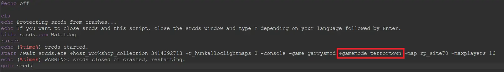 If you’re running a dedicated server and want to change your gamemode to TTT, open your batch file. Find the +gamemode parameter. In front of it, it should say “sandbox” by default. Change the value to terrortown. Save the file and load up your server.