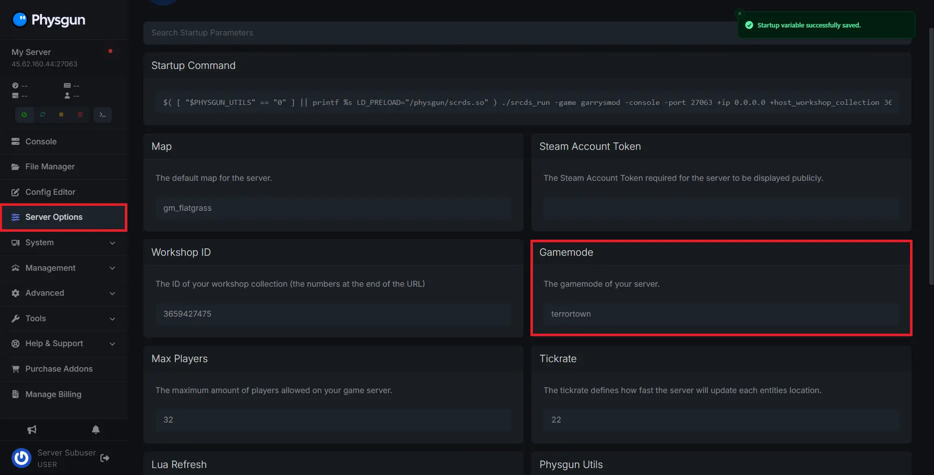If you’re a Physgun Client, login to your panel, navigate to the Server Options tab, and find the box labeled Gamemode.