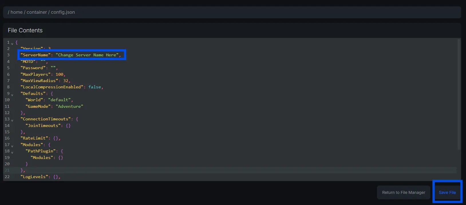 Change the “ServerName” variable to the name of your new Hytale server.