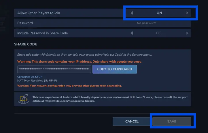 Toggle “Allow other players to join” to “Enabled”, click the “Save Button”