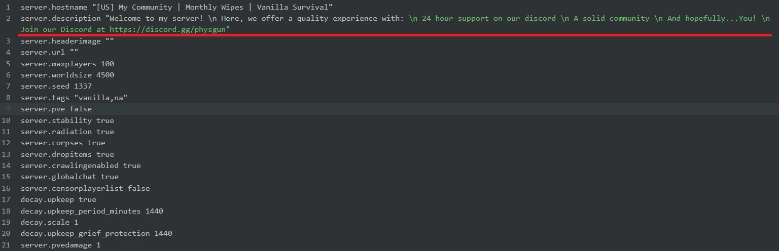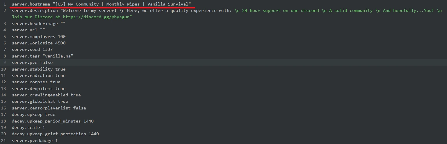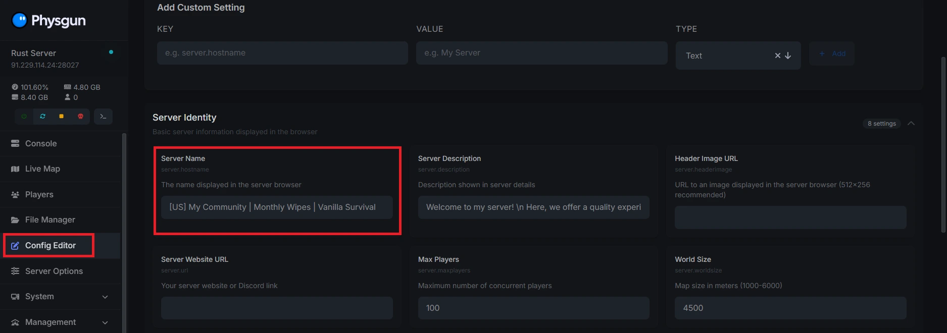 Alternatively, you can open your server’s configuration file located in server/rust/cfg/server.cfg.