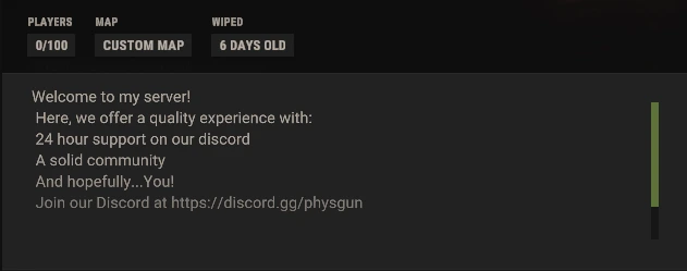 "Welcome to my server! \n Here, we offer a quality experience with: \n 24 hour support on our discord \n A solid community \n And hopefully...You! \n Join our Discord at https://discord.gg/physgun"If you’ve followed all of the steps correctly, the results should look like this: