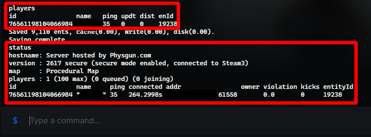 statusThe status command shows the server name, a list of connected players, player IDs, and more.