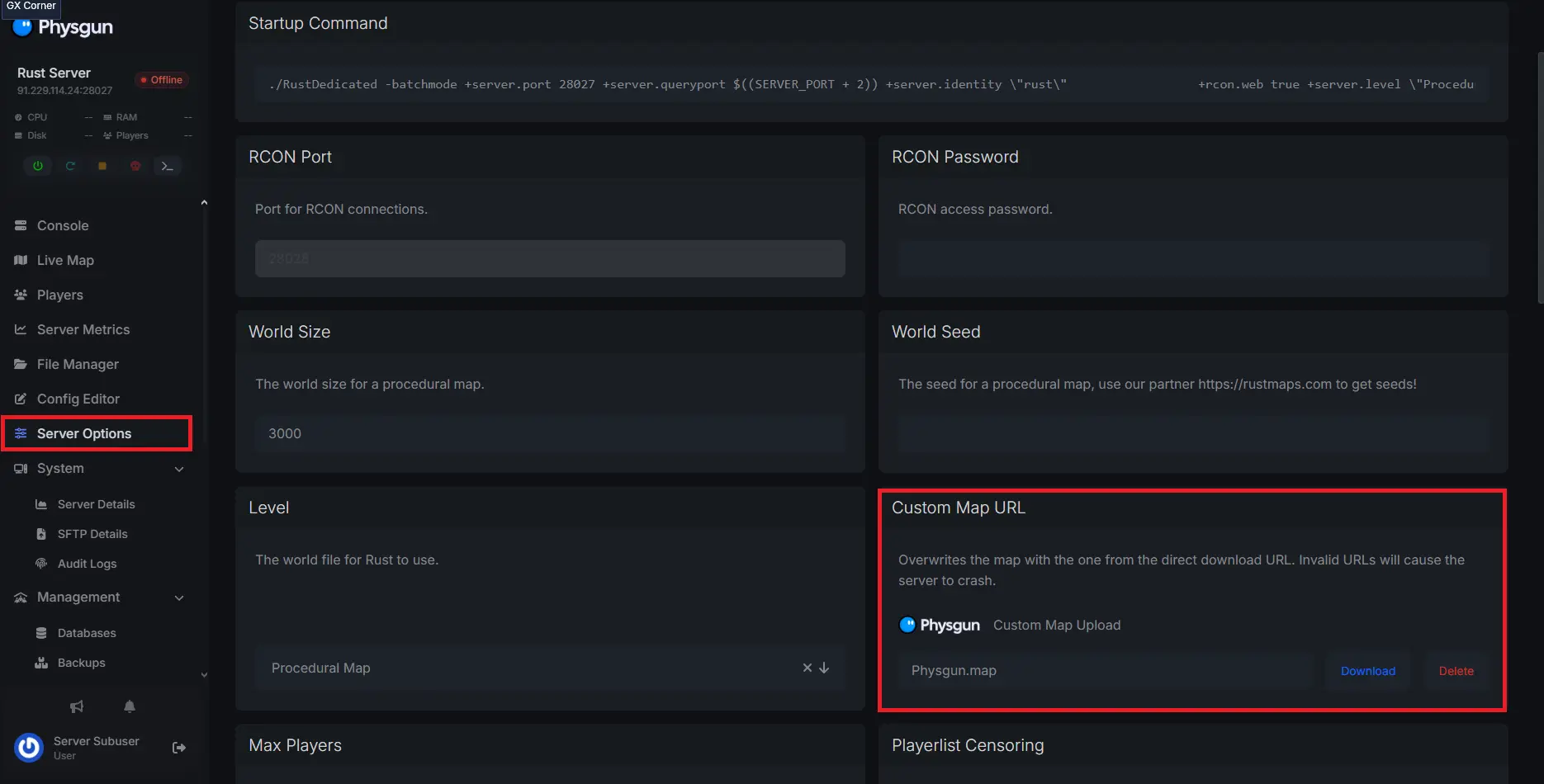 Now that you have a fully functional .map file, you have to upload it to your server. If you’re a Physgun client, log in to your server panel and navigate to the Server Options tab. In the Custom Map URL box, you can upload your map file here, and the panel will handle all of the in-between.
