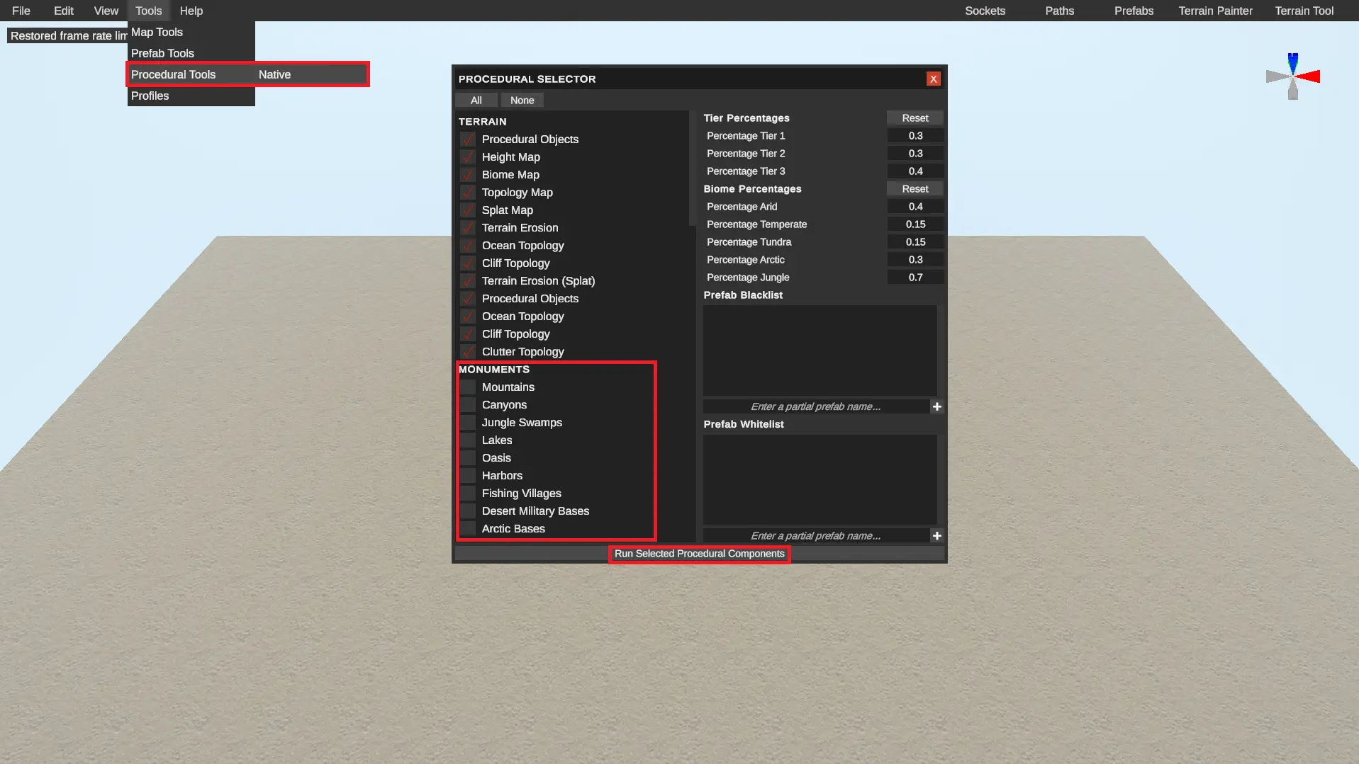 If you’re not looking to go crazy with your first map or you just need something quick, you should use procedural generation for your map. Go to Tools > Procedural Tools > Native and select all of the components you want in your generation. For the sake of this guide, deselect all monument options. This will make it impossible for monuments to show up in your map, which is easier than deleting all of them yourself. Make sure to check your generated map for errors. Procedural generation can affect your map, causing weird terrain glitches or floating rocks since it lacks human attention to detail.