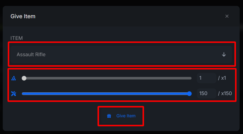 Using the dropdown that says Choose Item…, find the item you would like to give to the player. Use the sliders below to adjust item quantity and item condition.