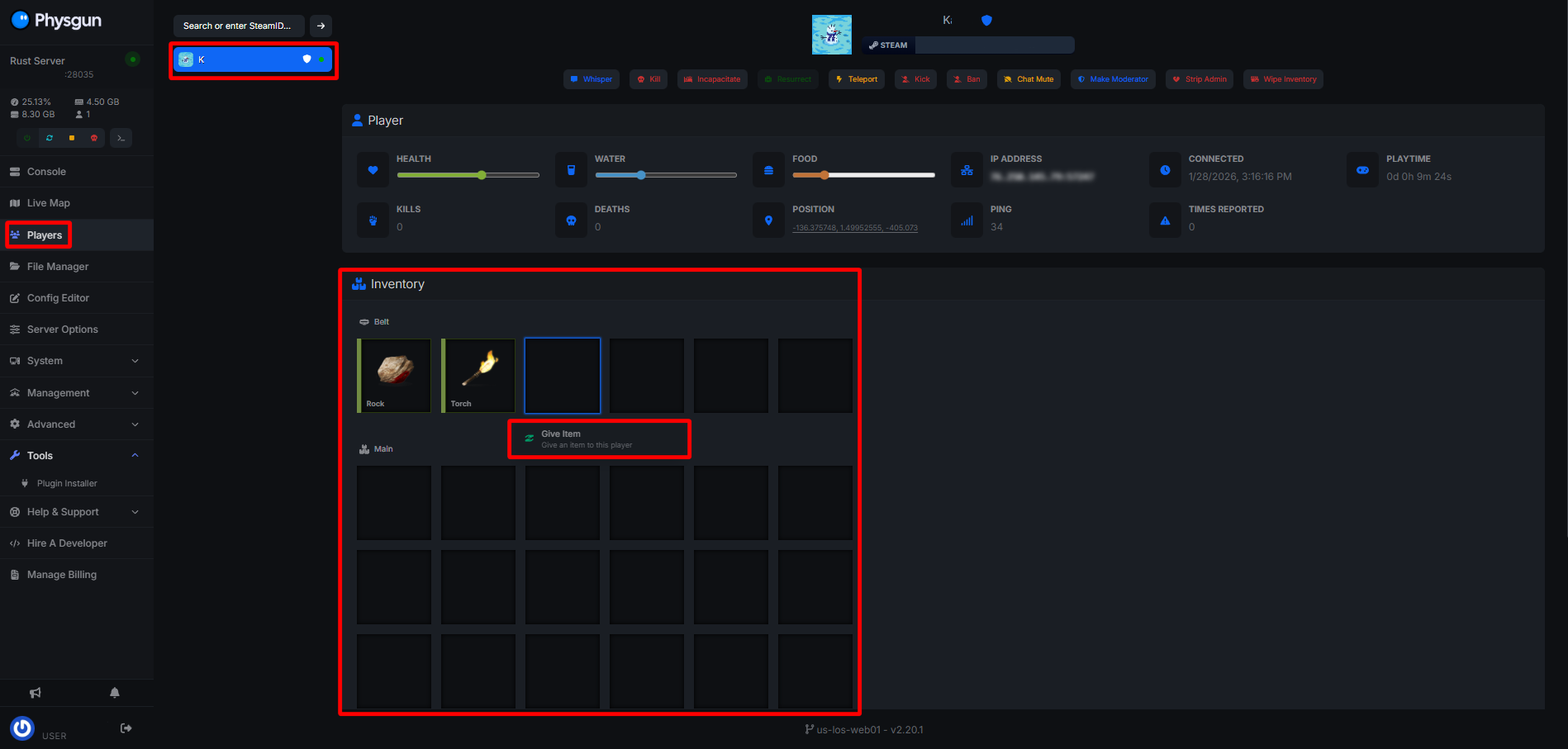 The Rust Admin Tools in the Physgun Gamepanel makes moderation and administrative tasks as easy as clicking some buttons! Giving a player an item requires no config changes, no needing to look up user info or usernames, and gives access to a state-of-the-art live map that makes moderation easy!