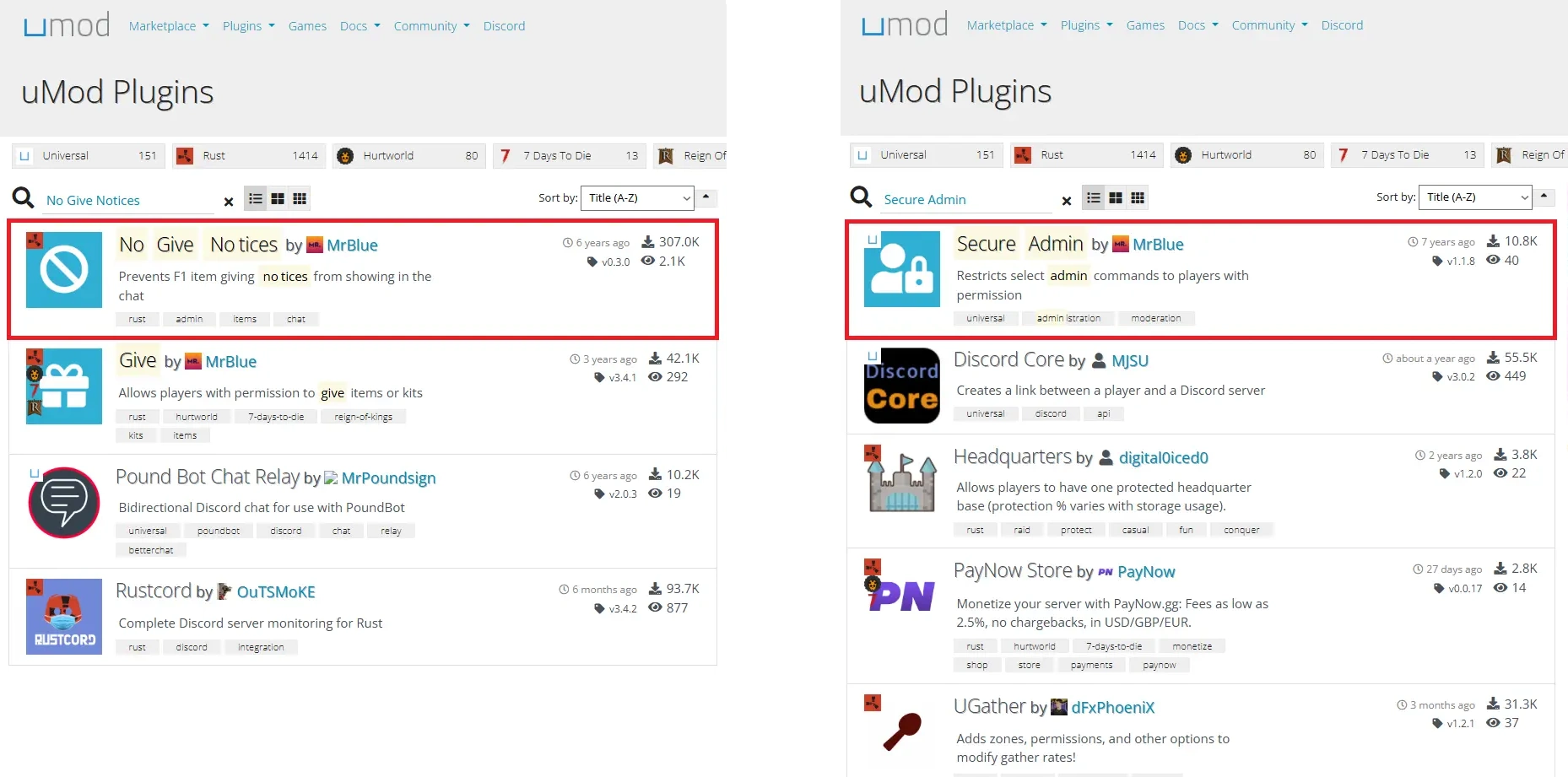 By searching under the plugins tab, you can find No Give Notices and Secure Admin. For context, No Give Notices will automatically prevent global chat messages when admins give items to themselves or other players, while Secure Admin offers the option to disable messages in global chat when players are kicked or banned.