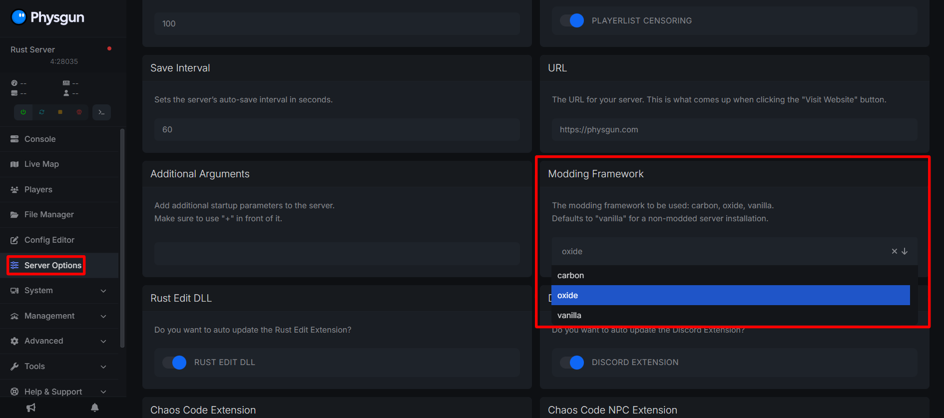To install Oxide on a Rust server through the Physgun Gamepanel: