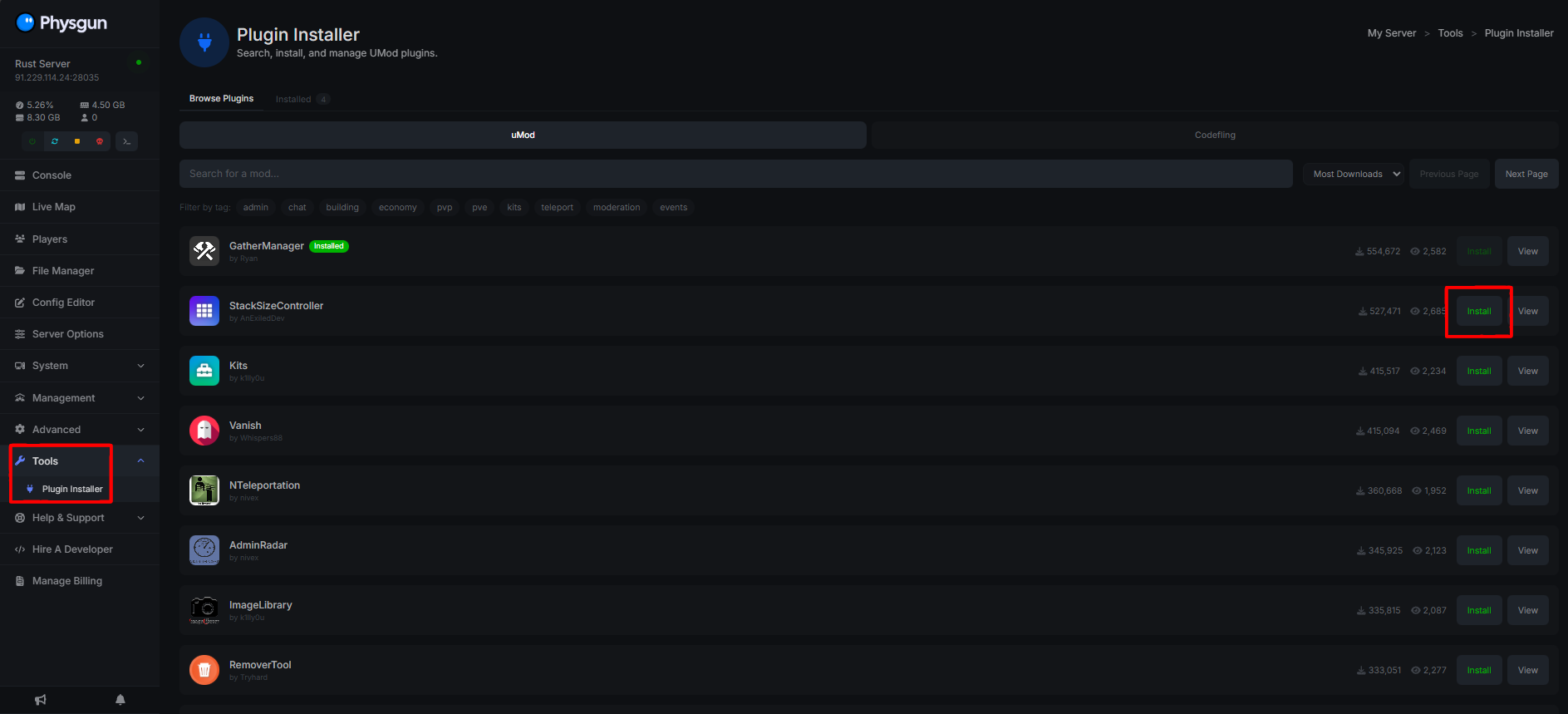 To add Oxide plugins to a Rust server through the Physgun Gamepanel: