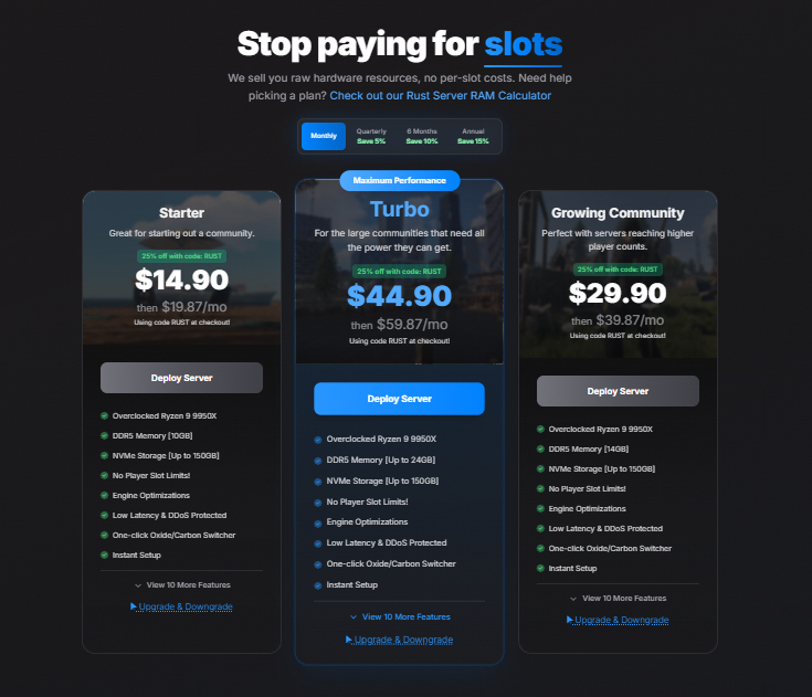 Physgun offers Rust server hosting that lets you deploy a dedicated Rust server in just minutes. Instead of paying for player slots, Physgun provides raw hardware resources, so you can scale your server as your community grows. All plans include DDoS protection, automatic backups, NVMe disk space, plugin support, full RCON access, and more.