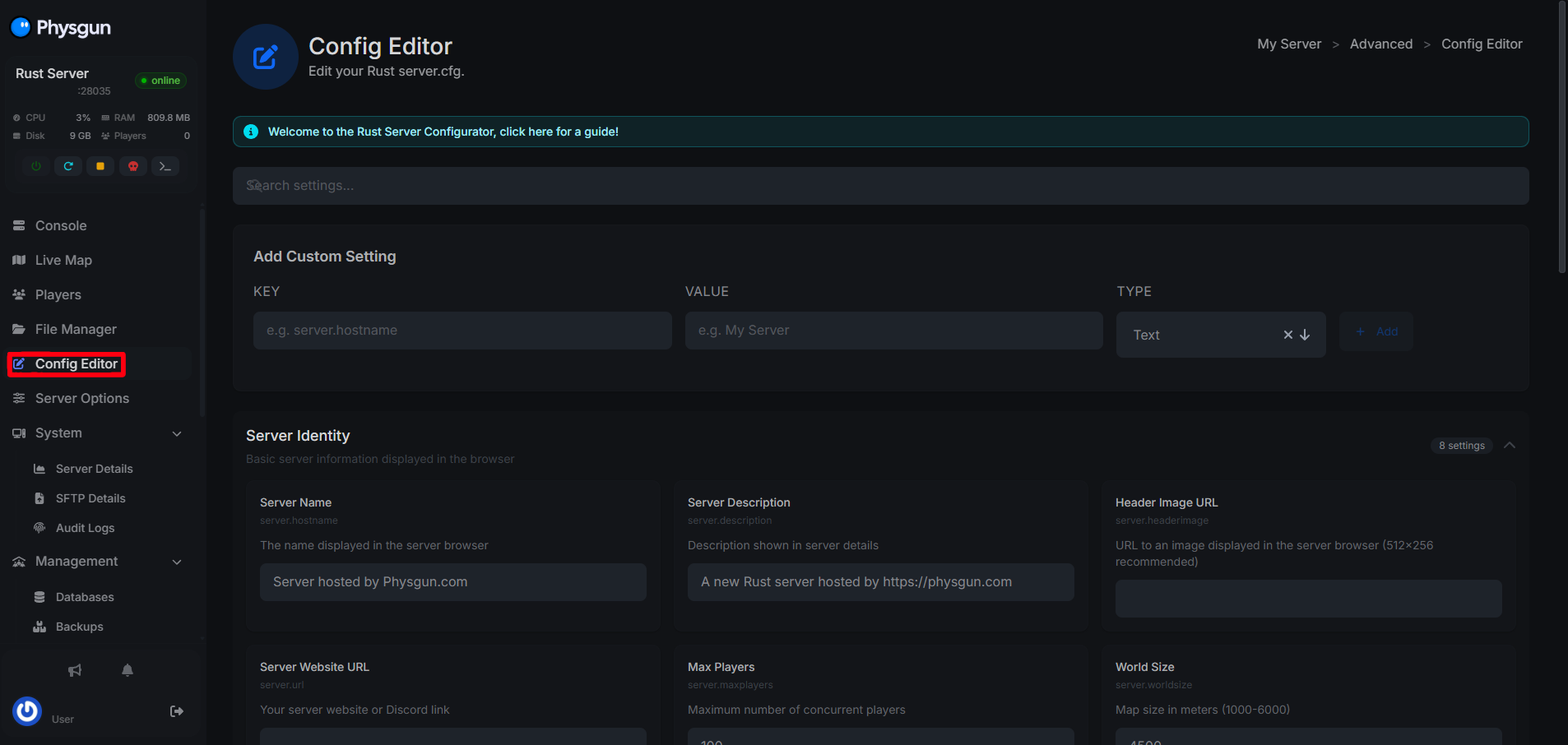 Login to the Gamepanel: After deployment is finished, head over to the Physgun GamePanel. there, you will see your Rust server ready to manage. Physgun’s modern gamepanel allows you to click to change settings like the hostname or max players, without ever touching the config files!