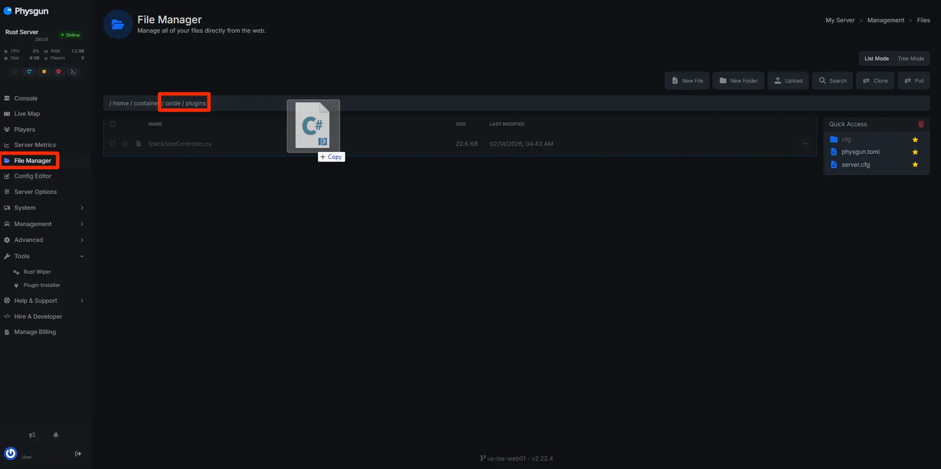 Upload the Plugin File: Go to your server files and navigate to /home/container/oxide/plugins, then upload the AdminRadar.cs file.