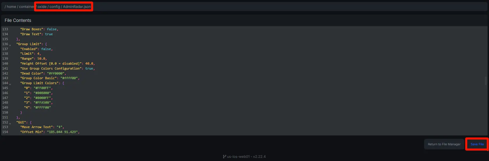 The Admin Radar plugin is highly customizable through its configuration file oxide/config/AdminRadar.json. You can quickly adjust what the radar shows, how it looks, and how it performs by editing this file.