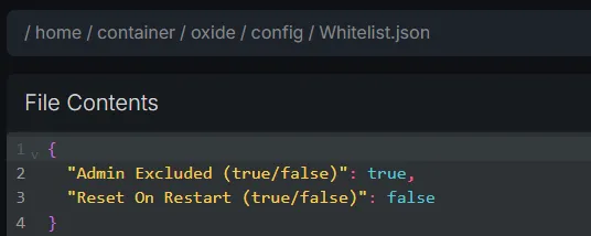 Once your server has restarted and the plugin has installed all of the necessary files, navigate to the oxide/config directory and open the Whitelist.json file. Here you will find the Admin Excluded and Reset on Restart options.